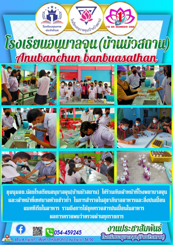ชุมนุมอย.น้อยโรงเรียนอนุบาลจุน(บ้านบัวสถาน) ได้ร่วมกับเจ้าหน้าที่โรงพยาบาลจุนและเจ้าหน้าที่เทศบาลห้วยข้าวก่ำ ในการสำรวจในสุขาภิบาลอาหารและสิ่งปนเปื้อนแบคทีเรียในอาหาร รวมถึงการใช้ชุดตรวจสารปนเปื้อนในอาหาร ผลการตรวจพบว่าตรวจผ่านทุกรายกา |